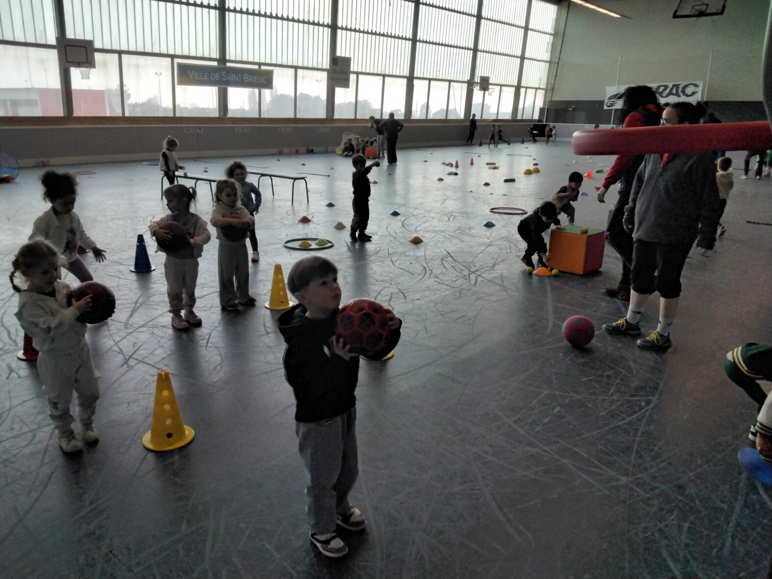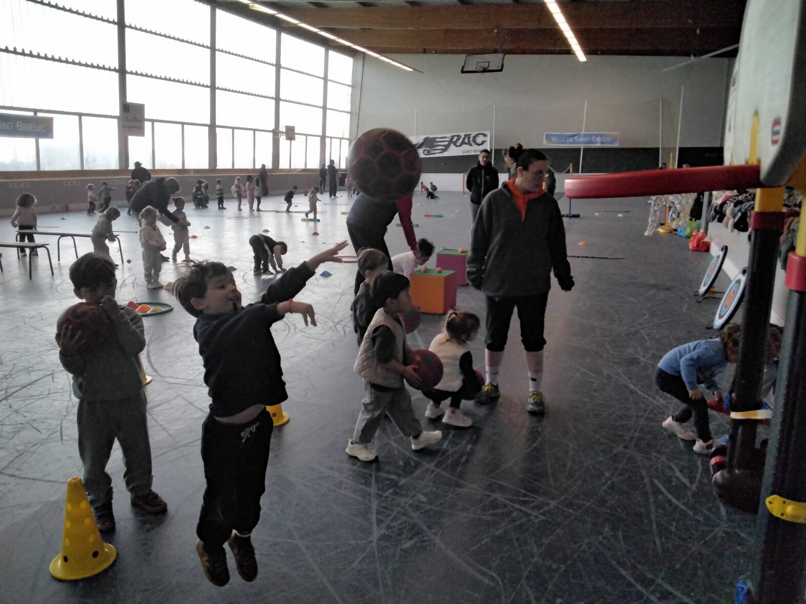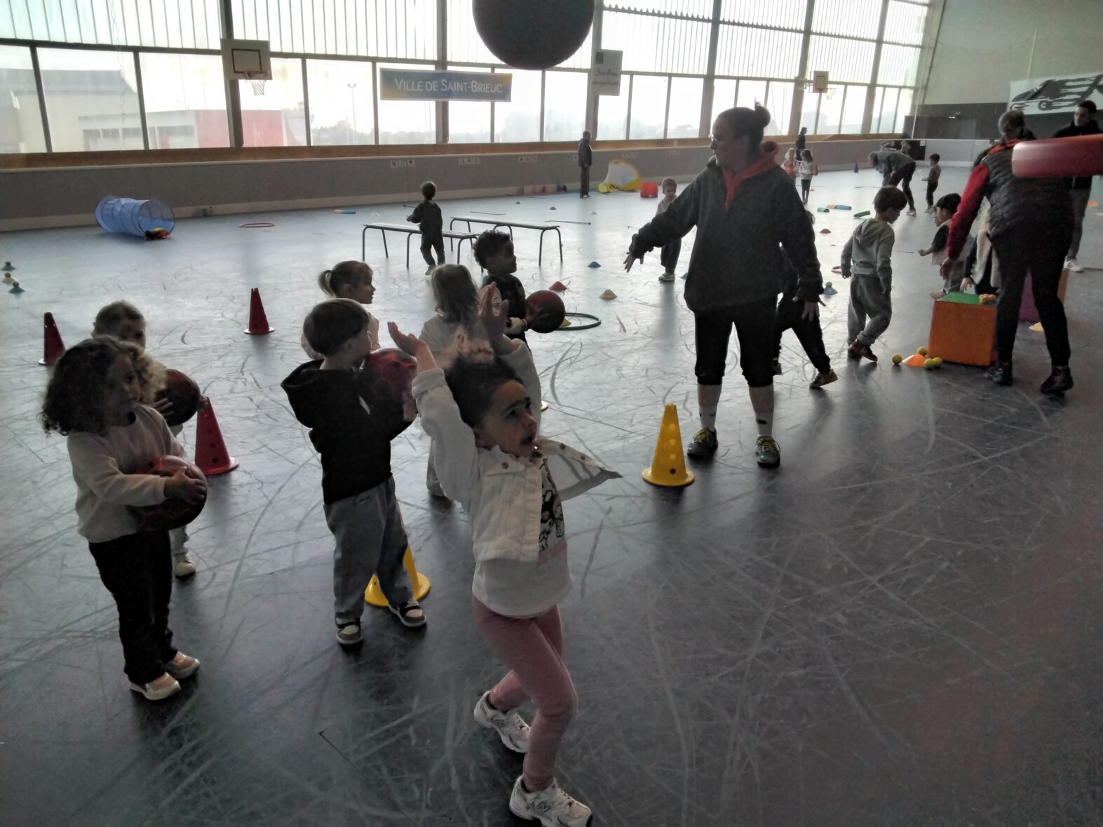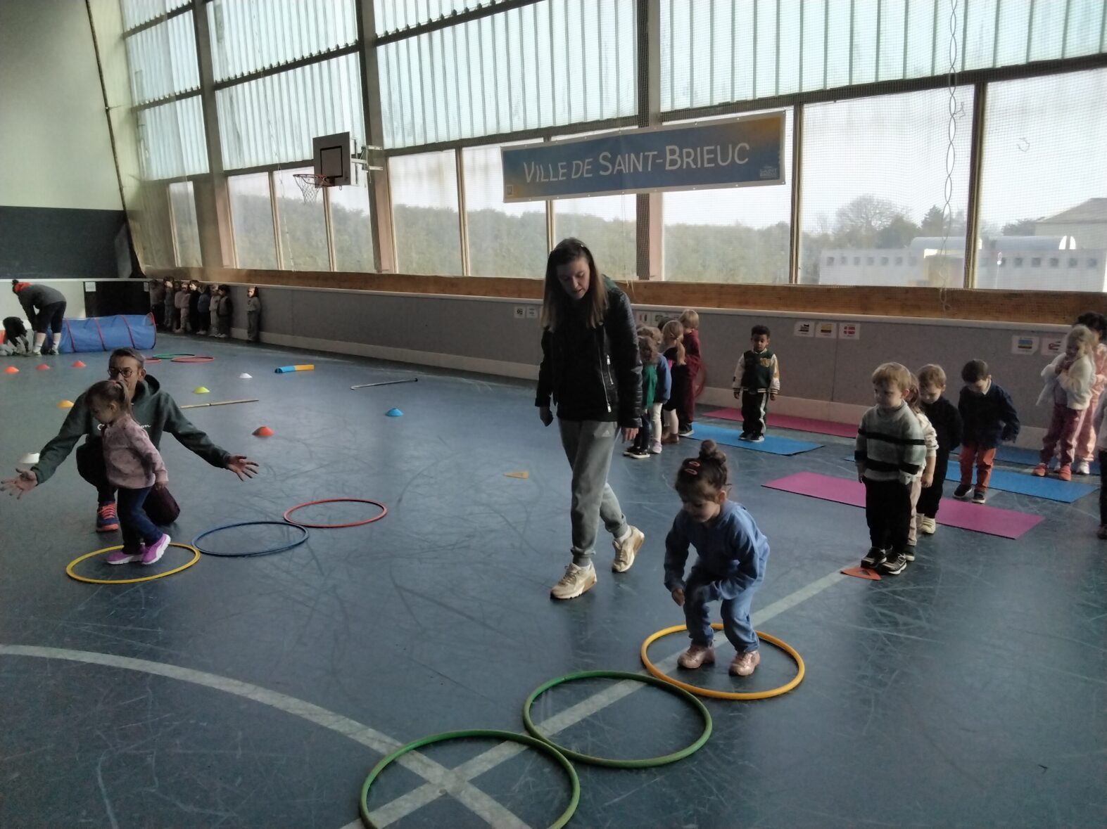 Ce lundi 23 mars, les 2 classes de TPS/PS et de PS/MS se sont rendues en car pour une animation sportive à l’ASPTT de PLérin.
