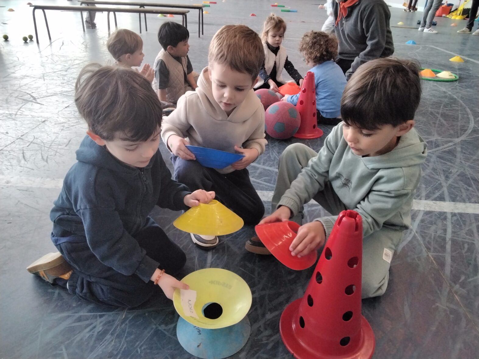 Nous avions constitué 3 groupes d’environ 15 enfants en mélangeant les TPS, PS et MS qui ont évolué sur différents ateliers.